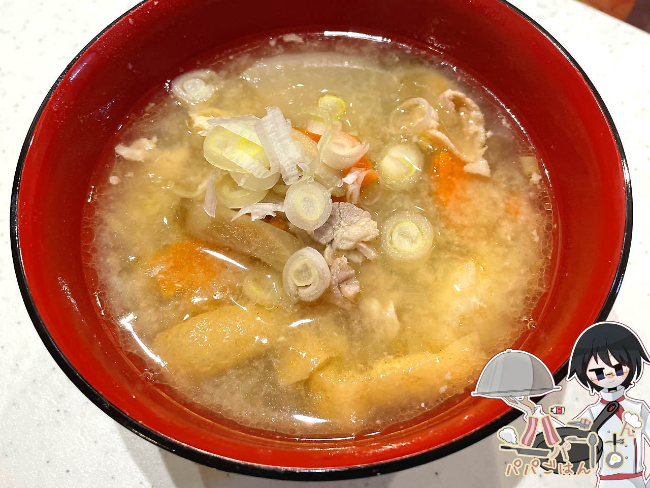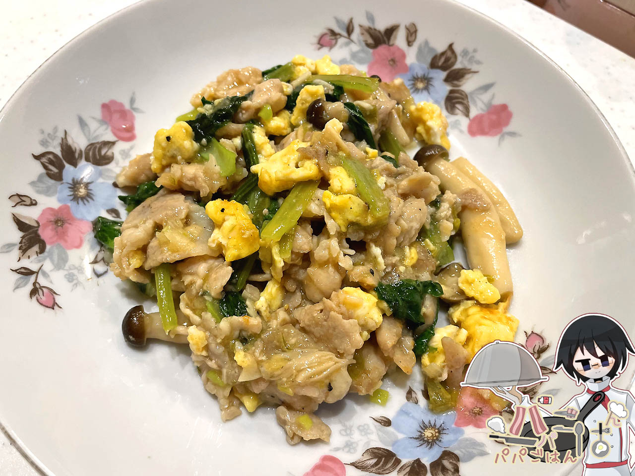 一旦カレーは忘れる事にして手持ちのレシピ・スキルと相談した結果、まずは残った炒りたまごと小松菜を使って 豚肉と小松菜の中華炒め を作成。更に簡単味噌汁を作り、切り昆布・ちくわ・たけのこの炒め煮と一緒に頂くことにしました。