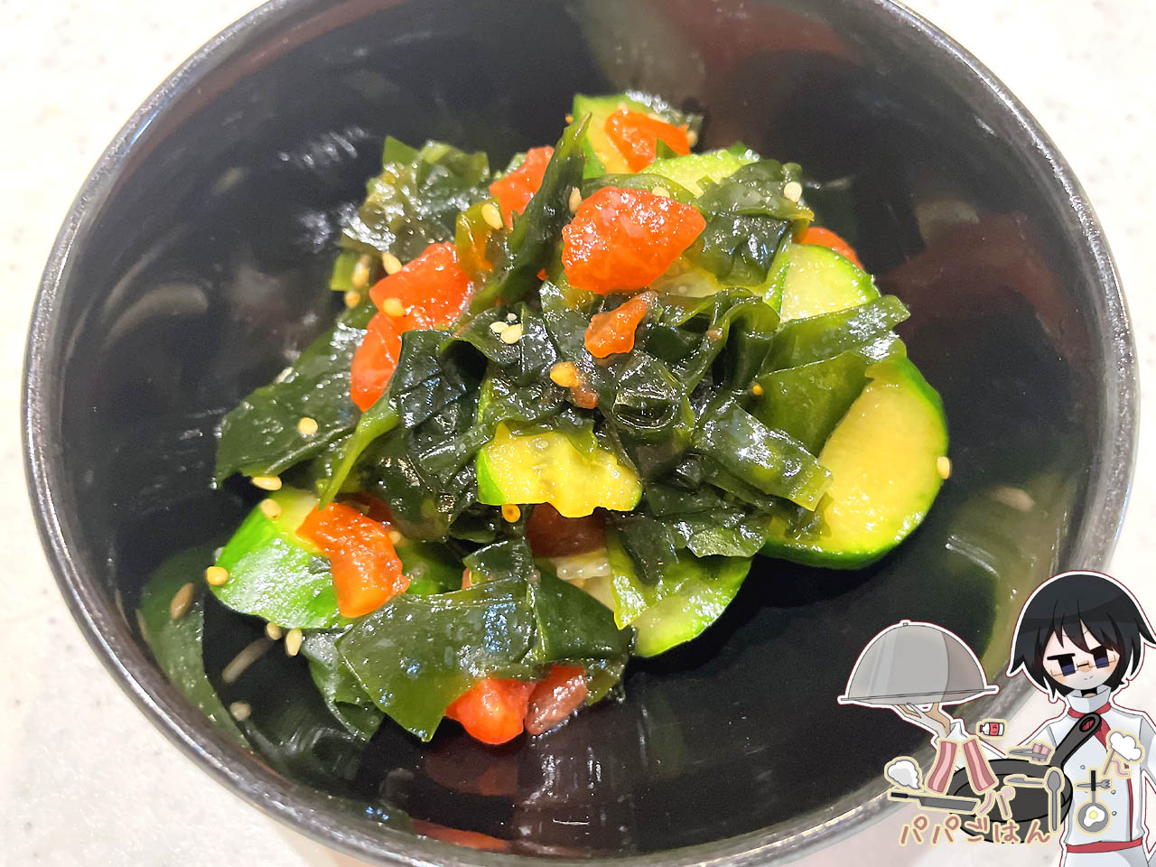 付け合わせは無難に きゅうり・トマト・わかめの中華風サラダ を作りました。
