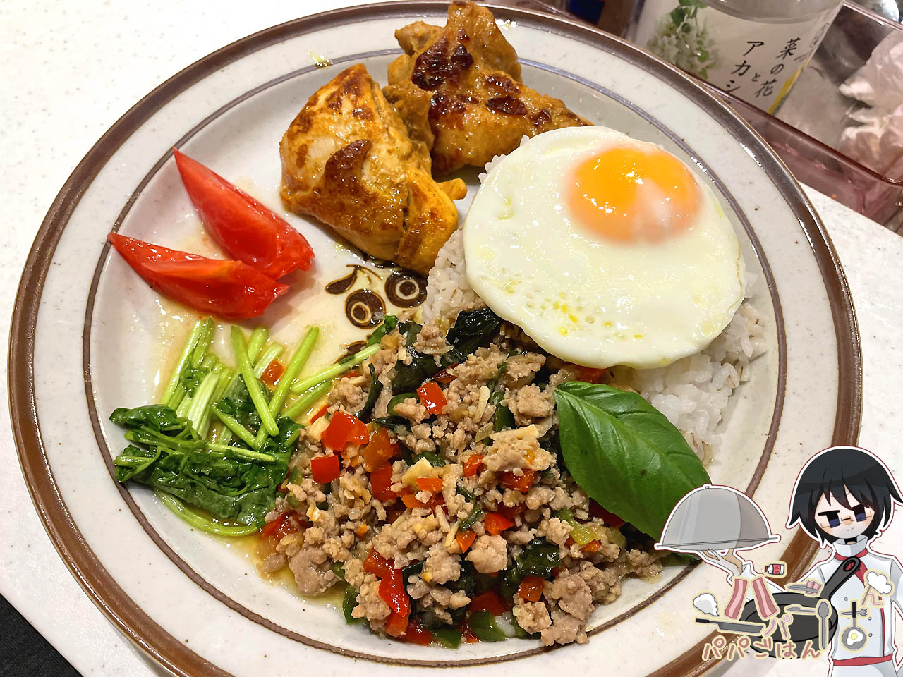 ガパオライスは、3人前なので挽肉300g・タマネギ1/2個・ピーマン2個・赤パプリカ1個・バジル18枚程度・たまご3個(目玉焼き用)...と具材は増量したものの、ソースはナンプラー小さじ2+オイスターソース大さじ1+醤油小さじ1+ハチミツ小さじ1/2...とほぼ参考レシピと同じ分量で作り、りく が辛いの苦手なので、唐辛子は控えめに入れました。