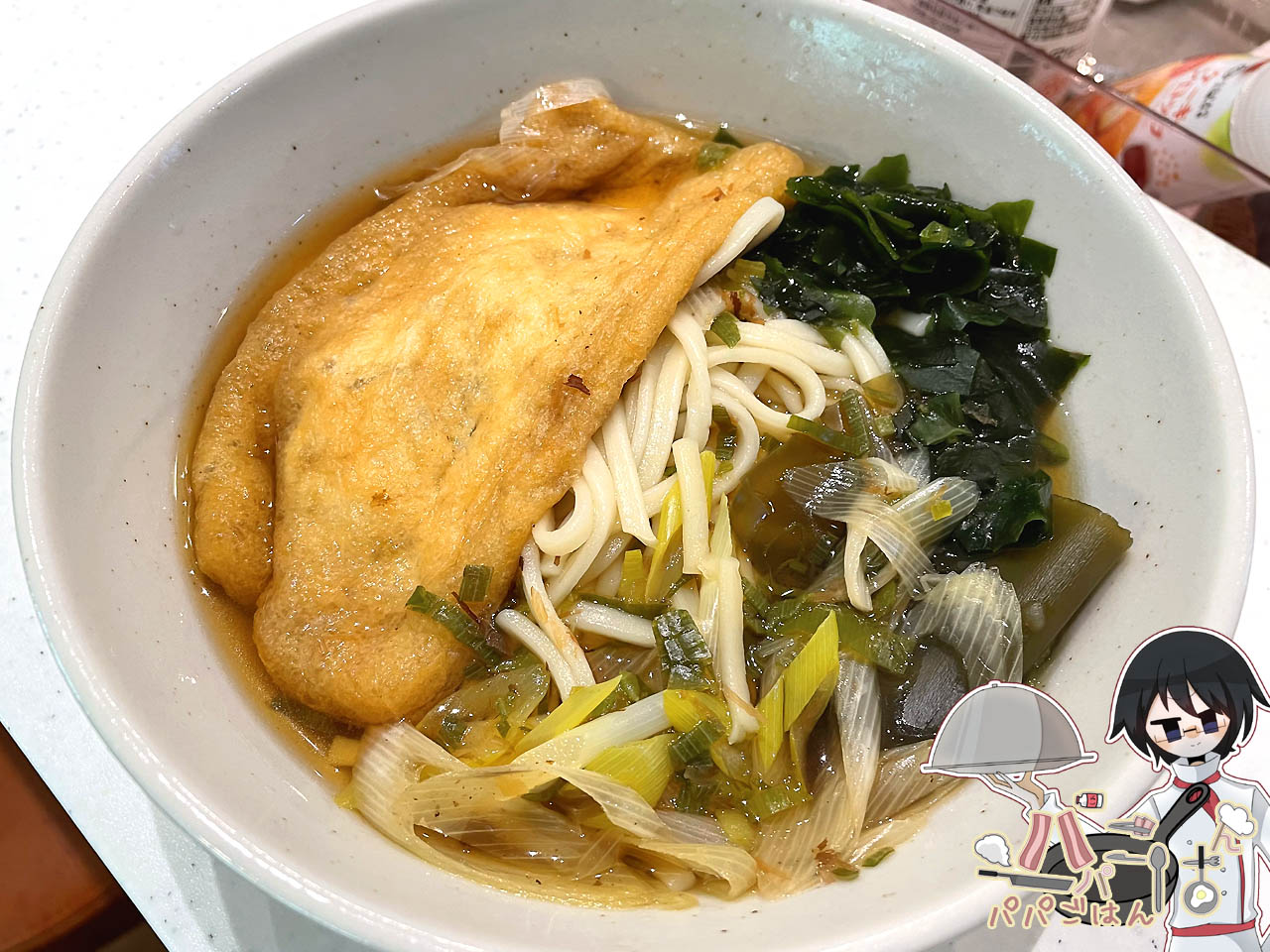 独りの時はミジン切りにしたネギをあとがけする程度なのだけど、りく は生のネギが苦手なので薄い斜め切りにして汁で少し煮込み、トッピングもワカメを足してみました。