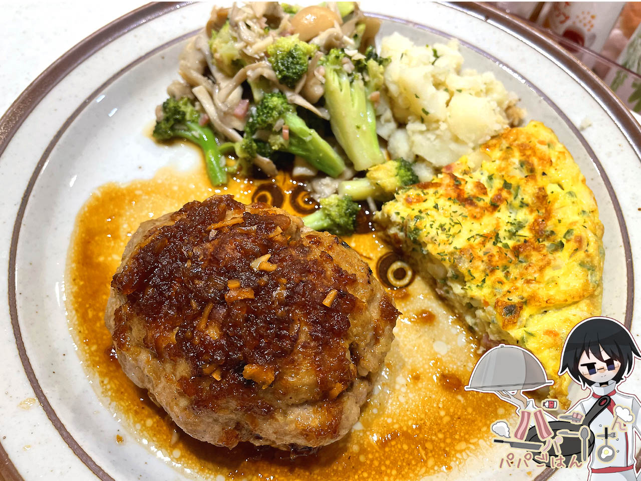 この日は前述の通り、本人希望で1日遅れの ママ の誕生日ディナー。リクエストされた ママ の好物のハンバーグに、きりざい入りフリッタータ ・きのことブロッコリーのペペ炒め・イタリアン粉ふき芋 をワンプレートにして、たっぷりきのこのクリームスープ ・ハムときゅうりのサラダを付け合わせにしました。ライスは本人希望で雑穀米入り麦飯。