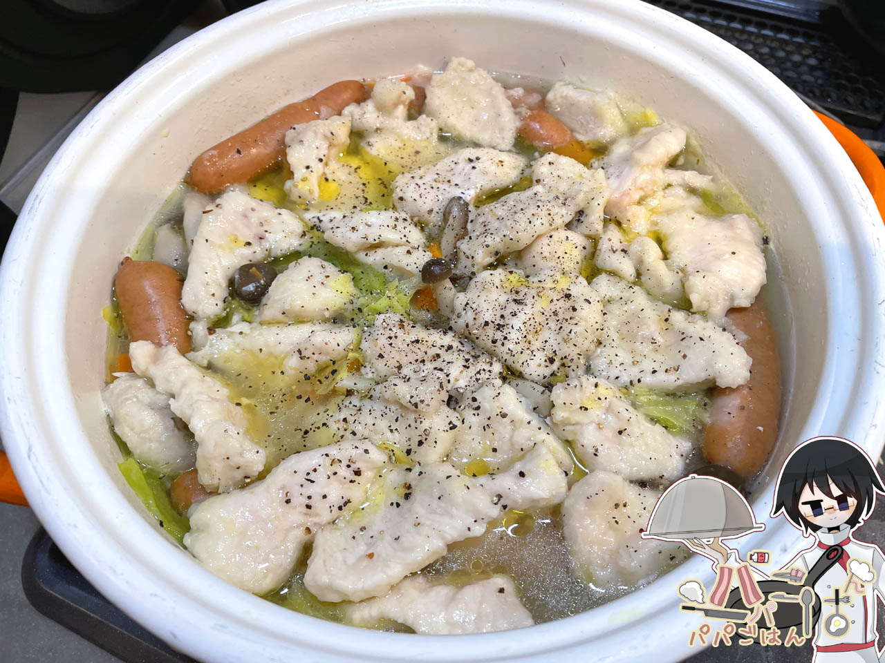 今回の鍋はニンニクを加えるアレンジをして、残っていた食材整理も行いました。まず、オリーブオイル・ニンニク(スプーン半杯程度)・ソーセージを最初に炒めてオイルに香りをつけてから、(野菜に埋もれそうなので)ソーセージを一旦取り出し、キャベツ・タマネギ(偶々余ってした1/2個分をスライス)・人参・きのこ(しめじ+冷凍きのこミックス)・水700ml・酒50ml・鶏ガラ(大さじ1+1/2)・鰹節(1つまみ程度)を入れて15分程度煮る。鶏胸肉は、皮をとってフォークで刺してから塩麹大さじ1で20分漬け込み、そぎ切りにしてから薄力粉をまぶし、キャベツが柔らかくなったタイミングでソーセージと共に鍋に投入して2~4分程度煮る。最後はオリジナルレシピ通りオリーブオイル(大さじ1/2程度)と黒胡椒をまぶして仕上げました。