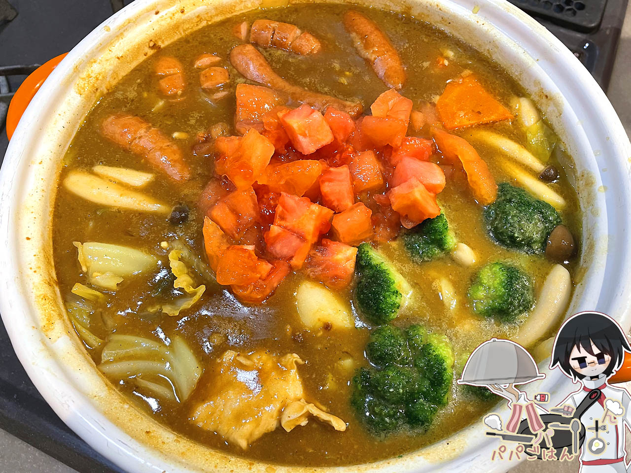 家族には「いつもと違う味わいがする」と好評でしたが、パパ 的には(カレーの濃度もあまり変わりない事から)"出来上がったカレーを鍋ごと提供した"のと変わりなく感じました。もう少し水分を多くして具材に油揚げを追加し、麺汁などでカレーうどん方向の味付けにした上で、締めに"うどん"とか出したらより鍋っぽくなるかな?という印象でした。