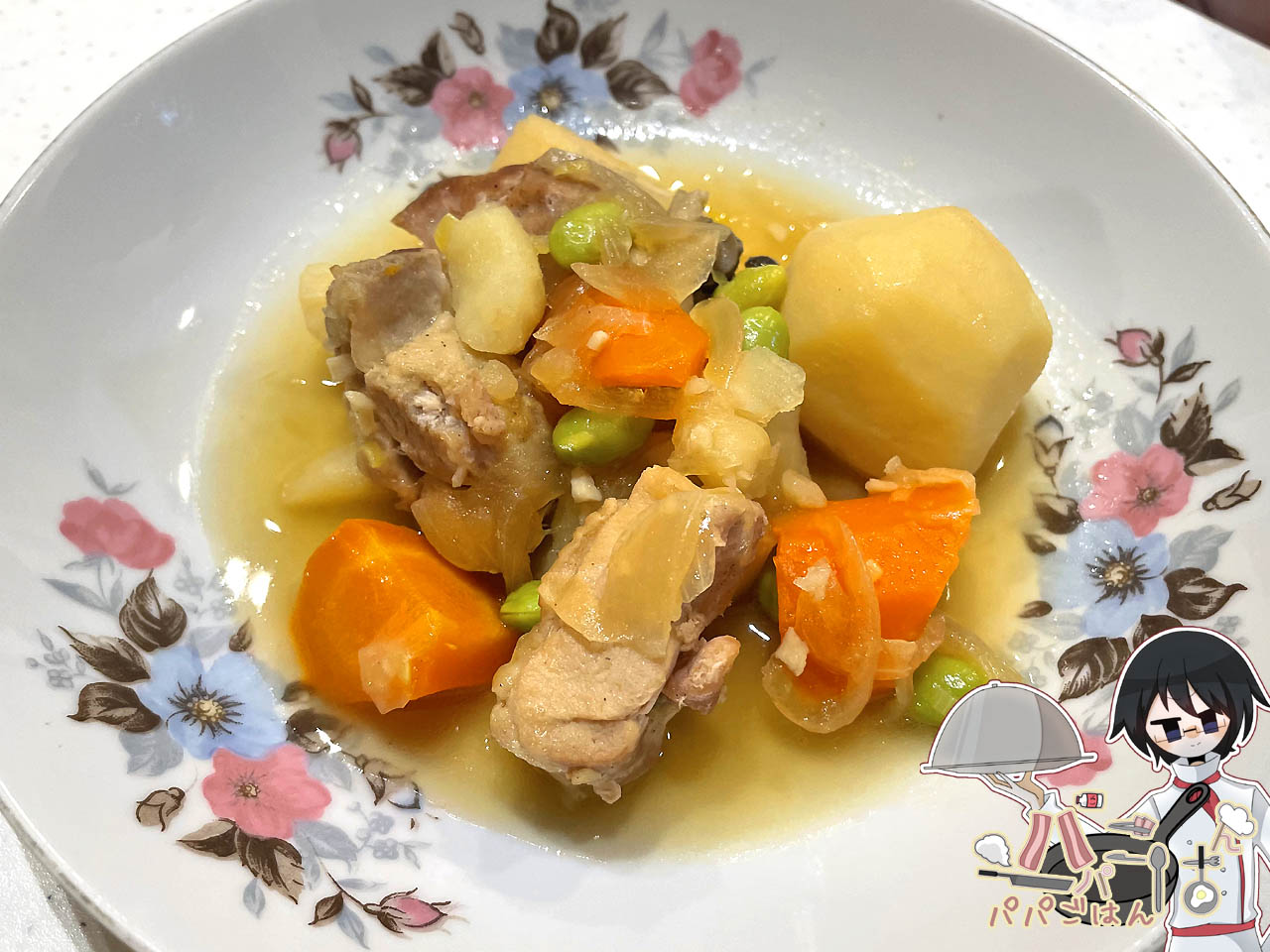 リンクは鶏胸肉を使ったレシピですが、今回は生憎切らしていたため鶏もも肉2枚を使っている以外は同じ作り方になっています。鶏もも肉は掃除後塩胡椒して油をしかずに皮目からフライパンに投入。皮目に良い感じの焼き色がついたら裏返して蓋をし、身側を2分程蒸し焼きにして食べやすい大きさに切っておき、レシピの工程6で鶏肉を投入して煮込んで完成です。