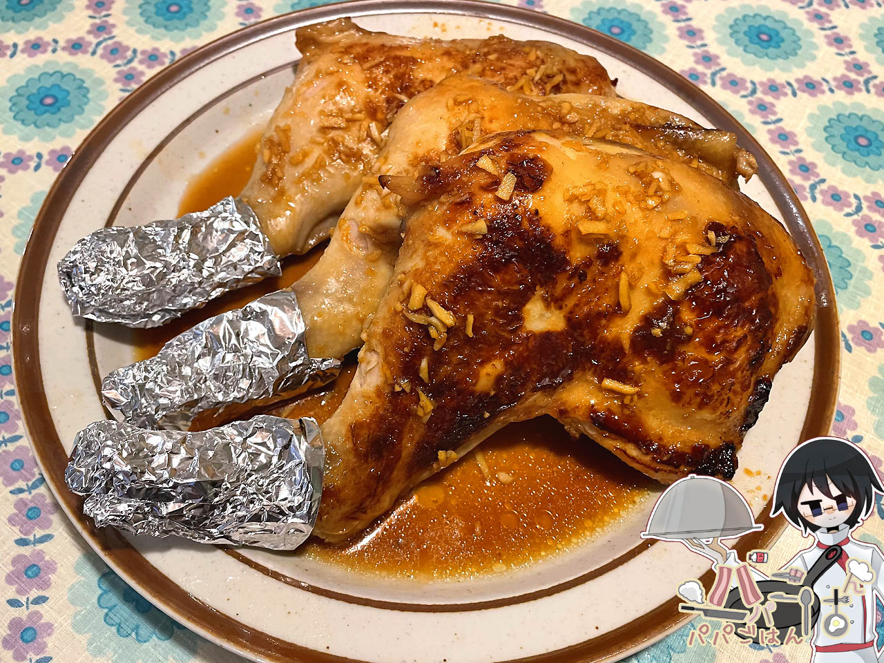 鶏料理は、「銀紙巻いた骨付き肉が食べたい!」という ママ の希望で、今年は骨付き鶏もも肉。揚げるか洋風の味付けにするか悩んだ末、りく が恐らく照り焼きを希望すると予想して、買った製品に添付されていたレシピ(たまたま照り焼きでしたw)の通りに作る方針に決定。