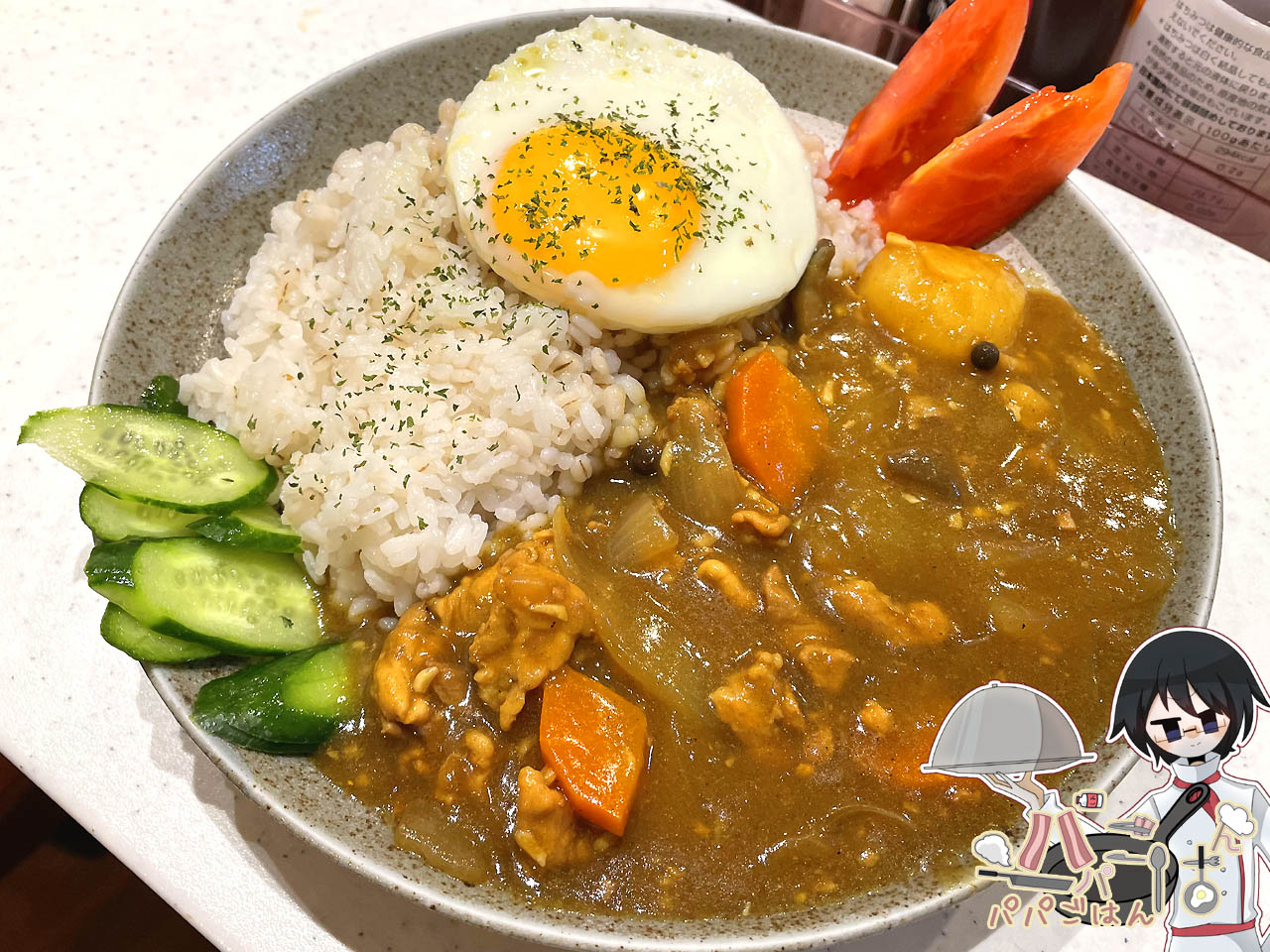 スライスしたきゅうりと串切りトマトを添えて終わりしようと思っていたのですが、りく が「このままだと少し辛い」と言っていたのを思い出してうっかり「目玉焼きでも焼く?」と聞いてしまったら目をキラキラさせて「焼く!」と即答されたのでトッピングする事になりましたw