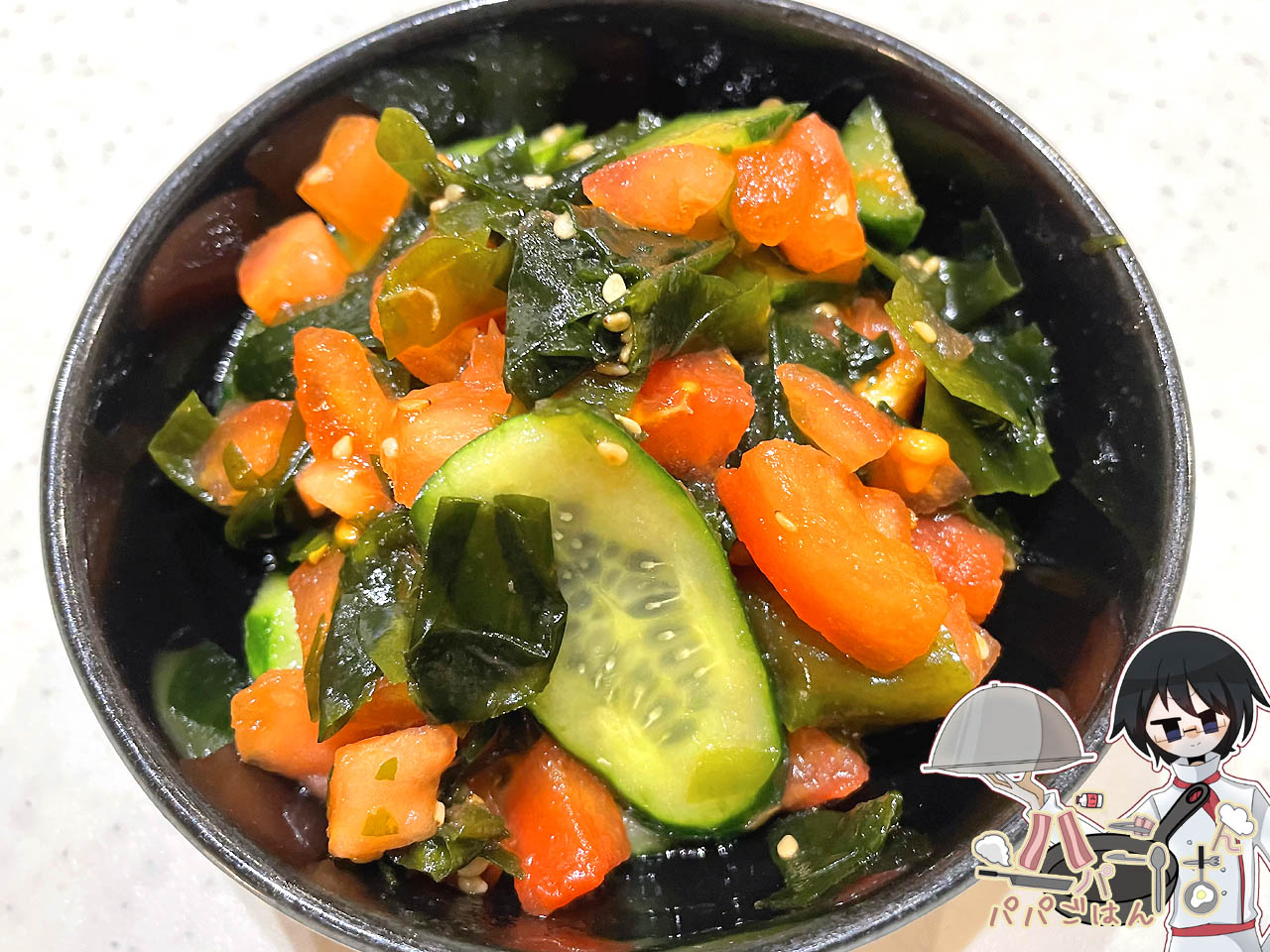 付け合わせは ママ のリクエストで、久しぶりに きゅうり・トマト・わかめの中華風サラダ を作りました。