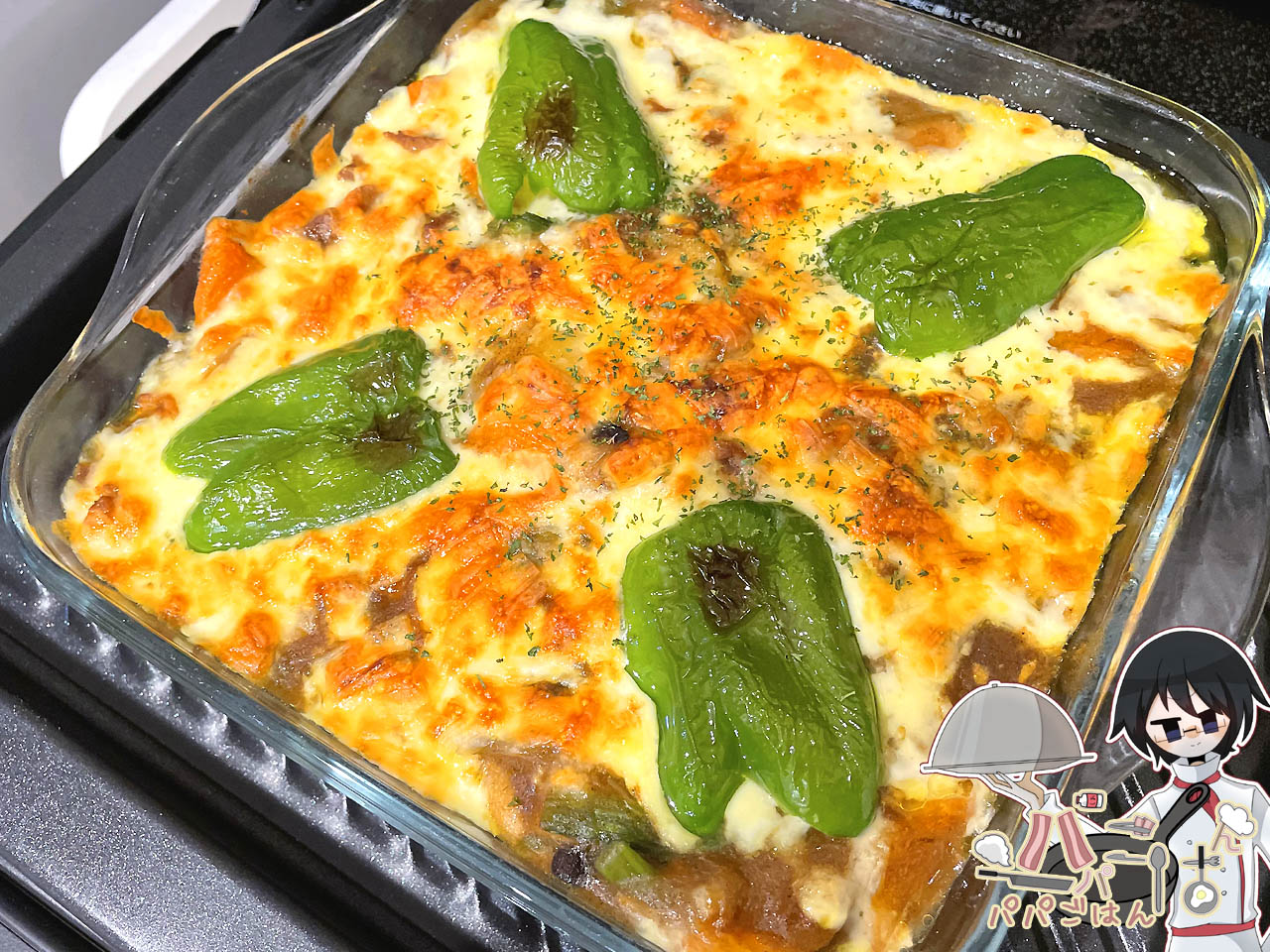 付け合わせメニューにトマトを使ったため、カブってしまうのを避ける都合ドリアはシンプルにピーマンだけのトッピングになりました。