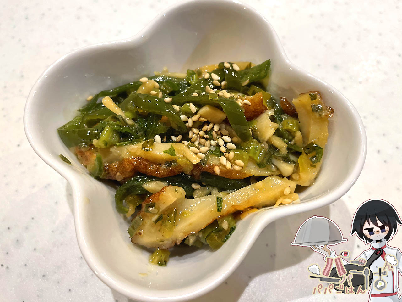 大根の葉をネギの青い部分を使ってしまいたかったのでもう一品、冷蔵庫にあったちくわとピーマンを使ってきんぴら的な物を作ってみました。作り方は、まず細かく刻んだネギ・刻みニンニクスプーン1杯程度をごま油で炒め、そこに斜め切りにしたちくわ・細切りにしたピーマン・細かく刻んだ大根の葉を入れ、醤油・みりん・料理酒各大さじ1を加えて水分がなくなるまで炒め合わせたら、炒りごまを振りかけるだけ。簡単なのに家族にはかなり好評でした♪
