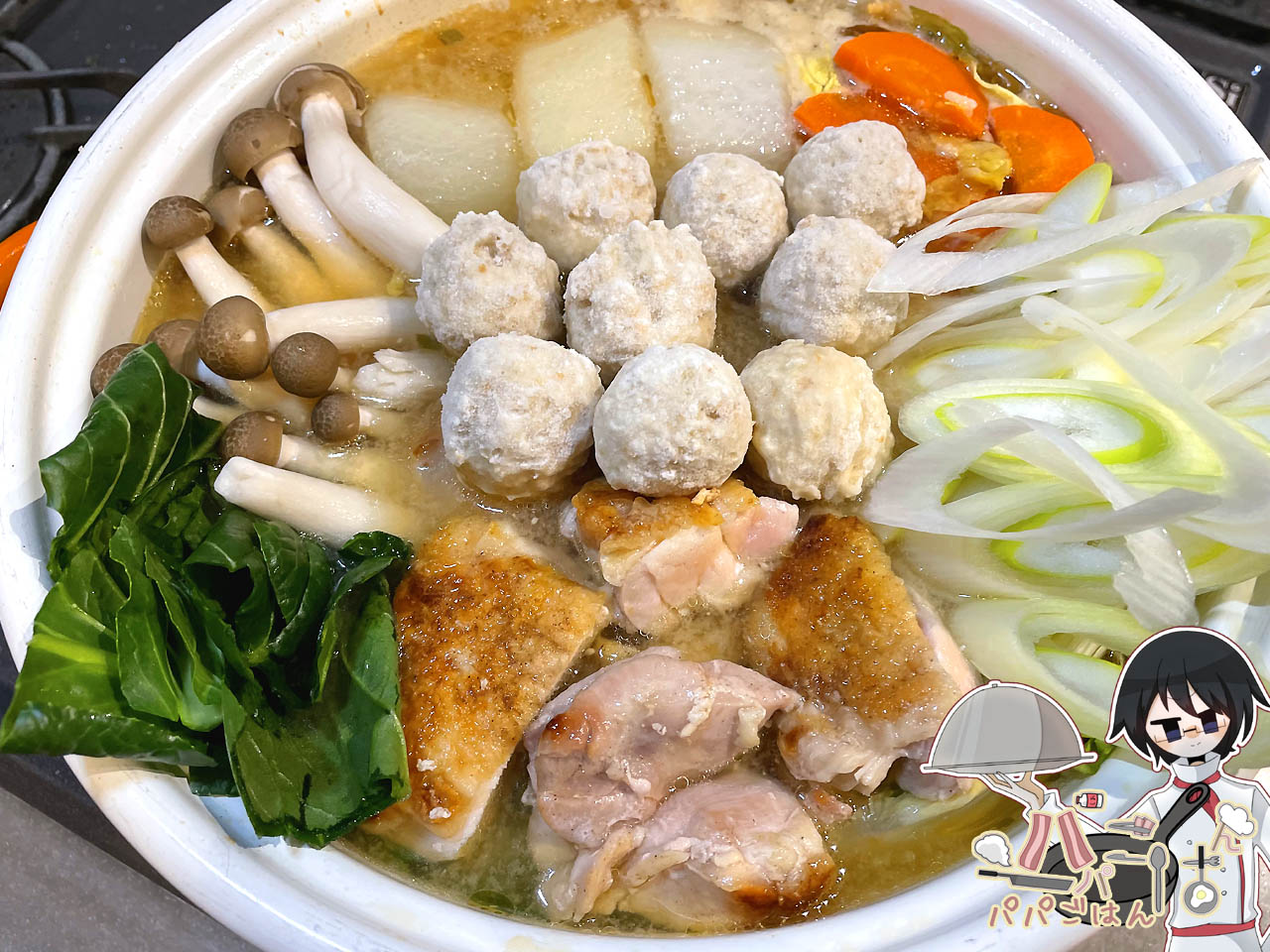 汁は、長ネギの青い部分が勿体なかったので刻み、ごま油で刻みニンニク&生姜チューブと共に炒め、香りが出てきたら水(700ml)・鶏ガラ(小さじ1+1/2)・料理酒&みりん(各大さじ3)・味噌(大さじ3)・醤油(小さじ1弱)を入れて沸かします。そこに、白菜・ニンジン・下茹でした大根を入れて10分程度煮たら、鶏もも・冷凍鶏団子を入れて5分、長ネギ・小松菜・きのこを入れて更に5分煮て完成です。