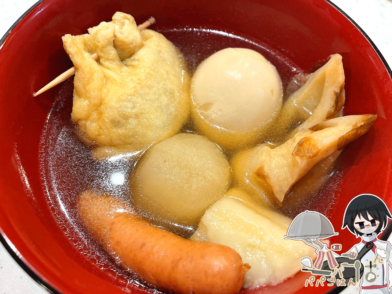 肉巾着の方は、分量はレシピページ記載と同じ。前述の通りちくわぶや竹輪も入れておでん風に仕上げる予定でしたが、冷蔵庫に大根・たまご・ソーセージがあったので、これらも投入した結果、ほぼ「おでん」として大きな鍋に一杯出来上がりましたw
