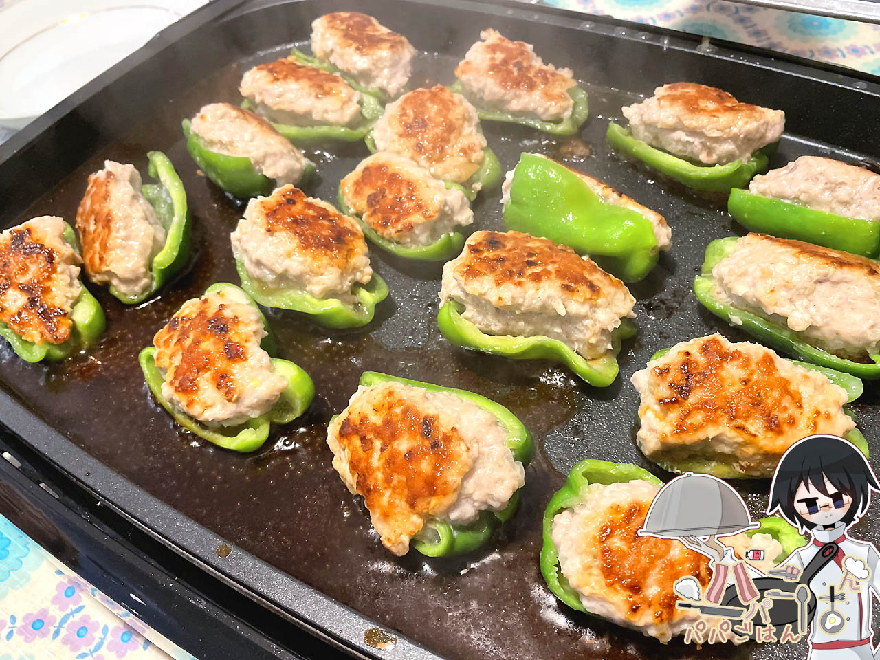 帰宅後に一休みしたら、いよいよ調理開始。ピーマンの肉詰めは、600gの挽肉を使ったタネを作り、買ってきたピーマン9個使って計18個作成。作り方は公開しているレシピ通りながら、今年は一昨年同様、ホットプレートで一気に焼く事にしました。指の負傷が未だ癒えてなかったため今日もゴム手袋着用だったので、ピーマンにタネを詰める作業は ママ に手伝ってもらいました。