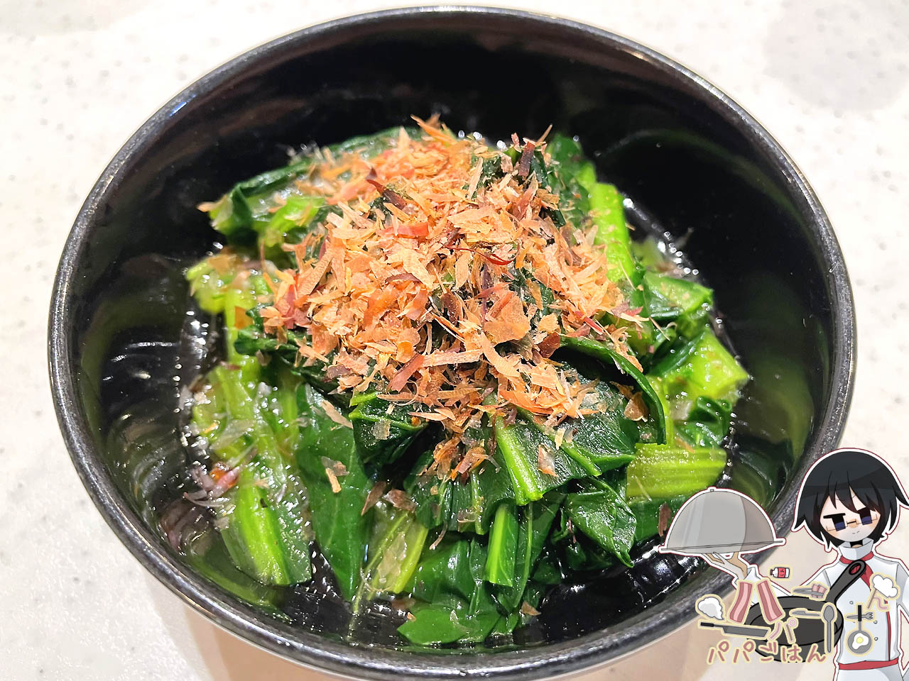 その他に、野菜が少ない気がしたので、りく に「ずっと食べていられる」と言わしめた小松菜のおひたしを副菜として作りました。