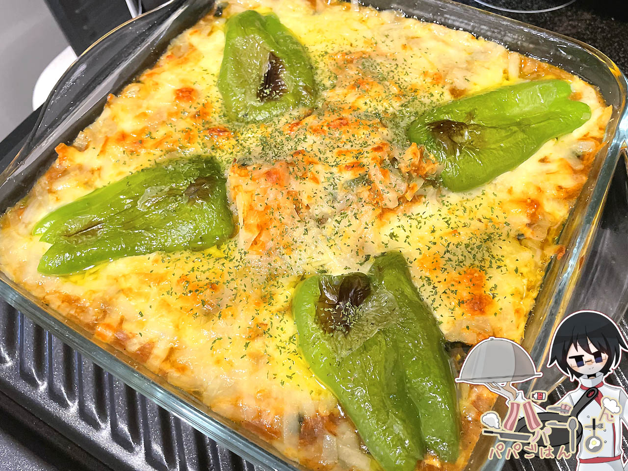 鶏胸蒸しカレー は、蒸した鶏胸肉の半量を具としてゴロっとサイズで残すため、今のところリメイクはドリア以外に思いつかず。今回もご飯の上に冷凍ほうれん草を加えて温めなおしたカレーをかけてチーズを散らし、りく の好物・ピーマンをトッピングしました。オーブンレンジ(Panasonic NE-BS5C )の下段で、余熱ナシ・250度・17分、オーブンモードで焼くのも、何もかもみないつも通りw