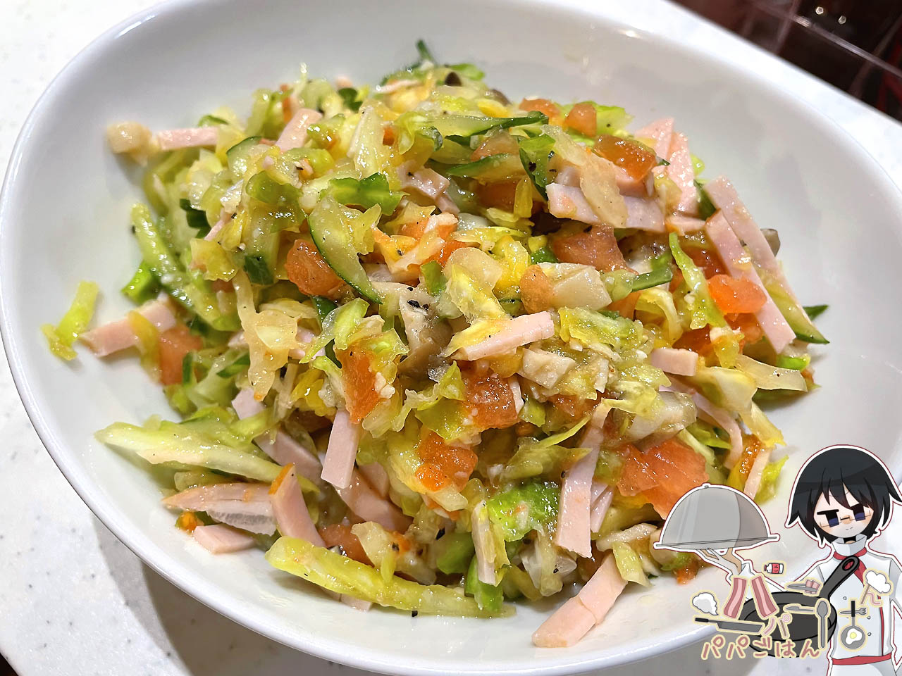 つけあわせは、いつもの"それっぽいサラダ"。今回は冷蔵庫に長居しているキャベツを使用。肉はいつものベーコンではなく残っていたハムを、ソースにはカレーに使って少し残ったしめじを入れてみました。