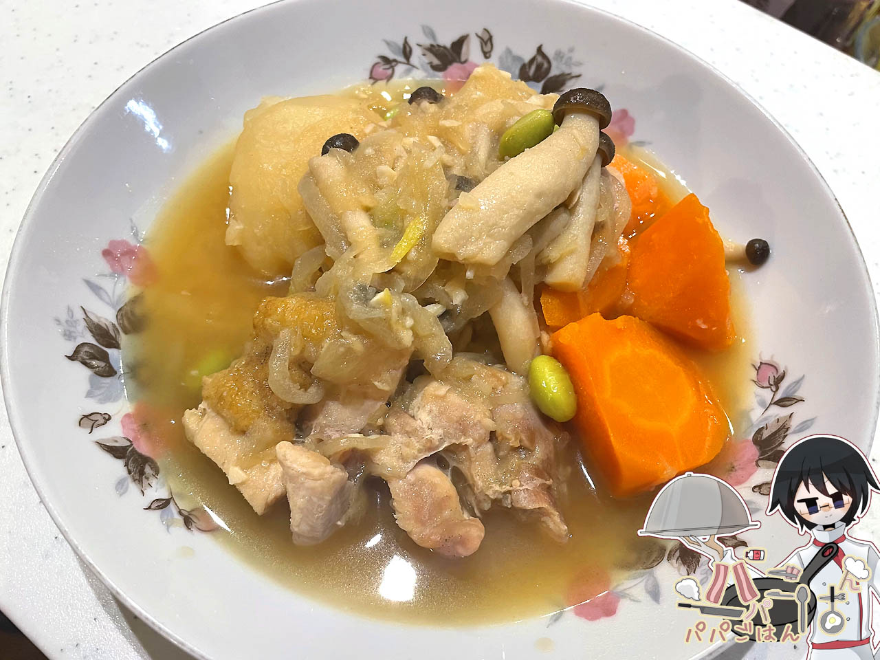 おかずは、いつもは鶏胸肉で作る事が多いのだけど生憎切らしていたため、鶏もも肉で 鶏じゃが 。リンクしたレシピは鶏胸肉版ですが、鶏もも肉に変えただけで他の作り方は同じです。