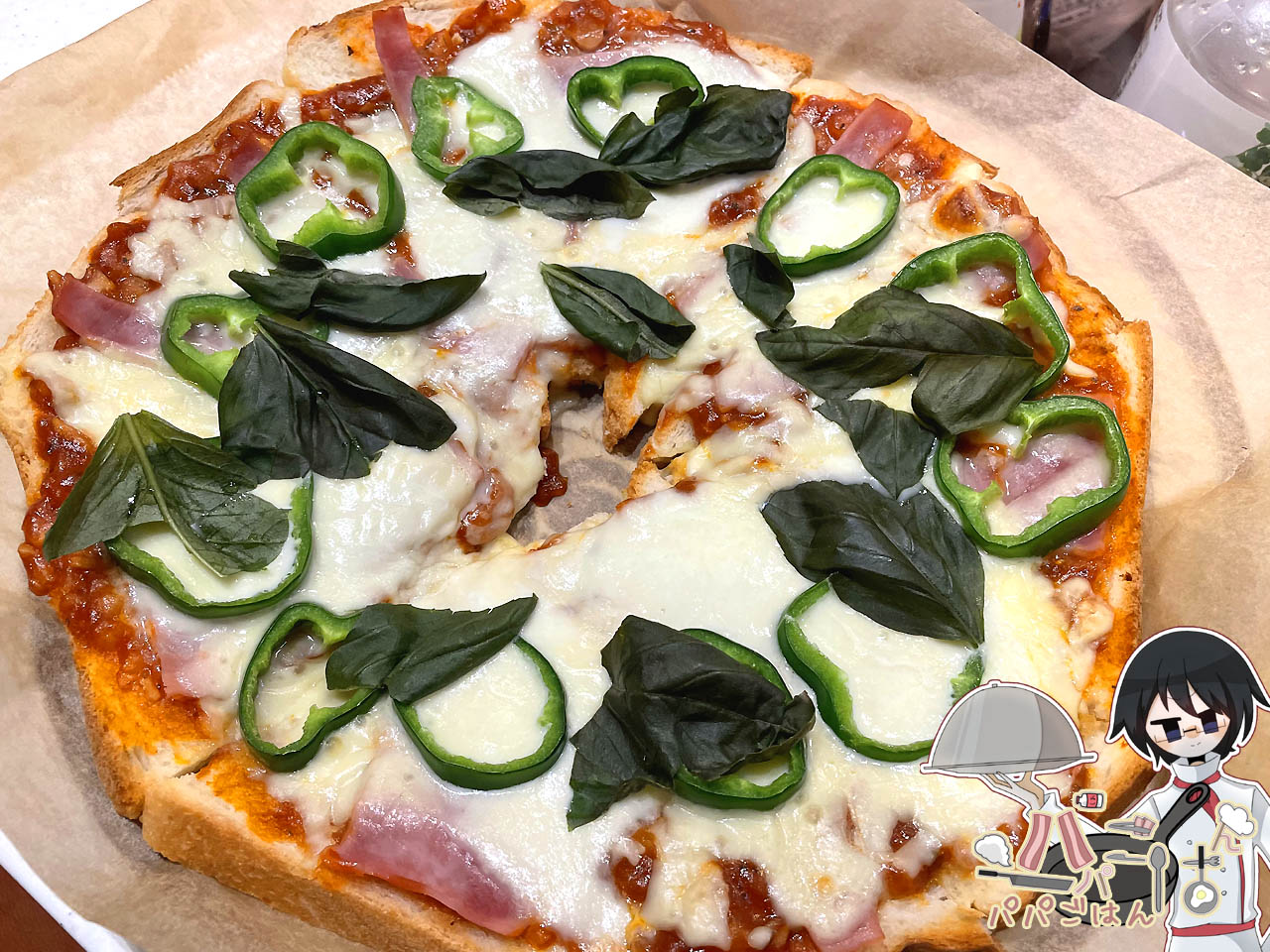 バジルの葉を適当な大きさにちぎってちらし、30秒程度オーブンで焼いて完成。